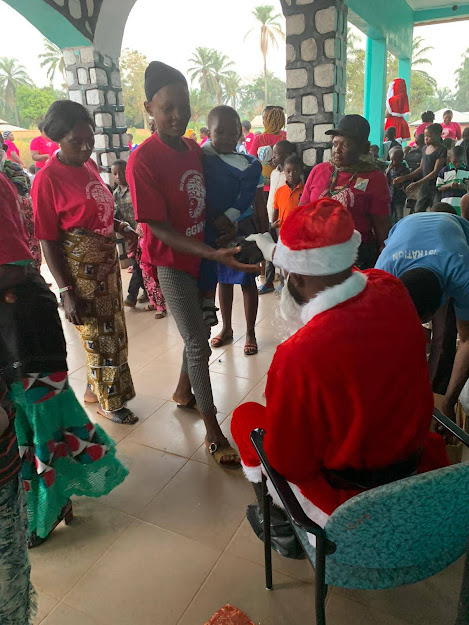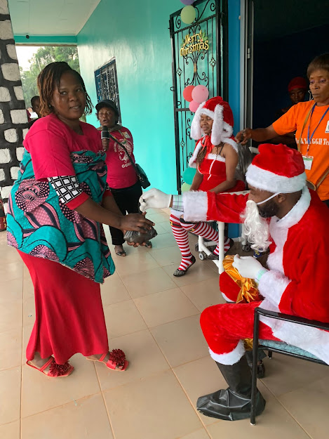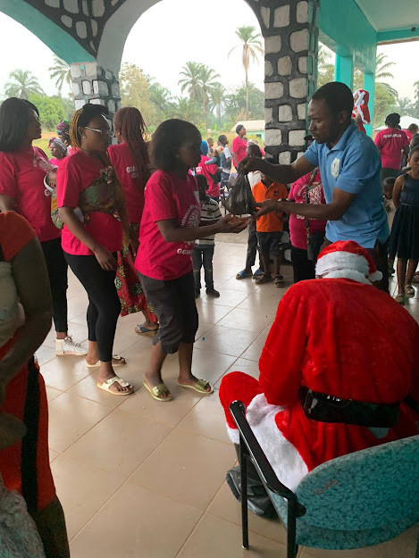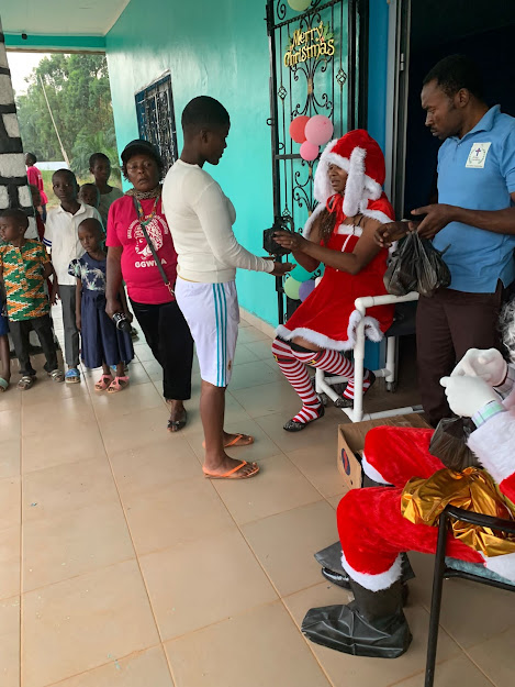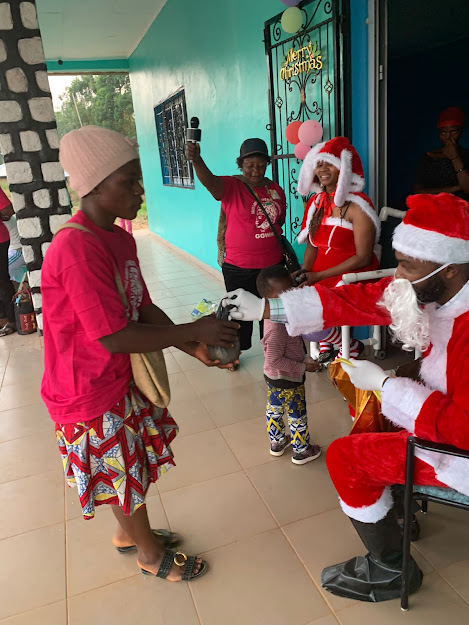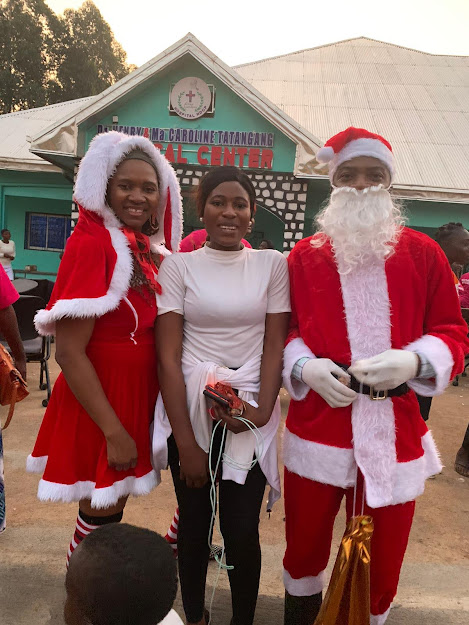 Nurse Emelda Posts as Mrs. Claus Santa gives soap, salt, maggie and toys Director helps Santa Mr. and Mrs. Claus Guest receives gift Santa came to Ndop Dr. Yongbang Valery as Santa Claus Mrs. Claus gives gifts to women and kids Mr. & Mrs. Claus bring smiles to the children of Ndop Santa in action